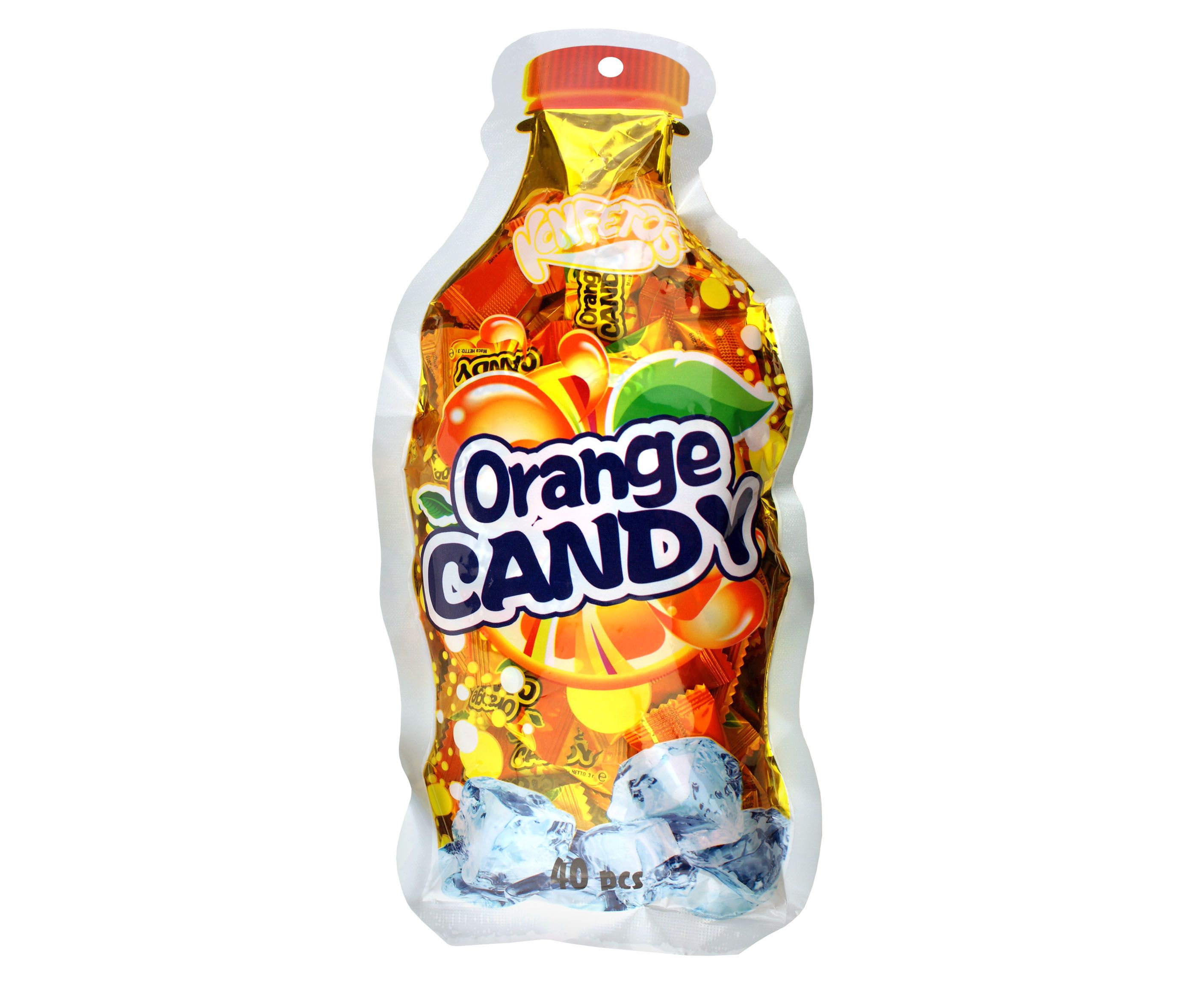 Кожна карамелька Orange Candy зі смаком апельсина, дбайливо упакована в індивідуальний пакетик. Упаковка із щільного поліетилену виконана у формі пляшки популярного напою та містить 120 грам карамельних ласощів.