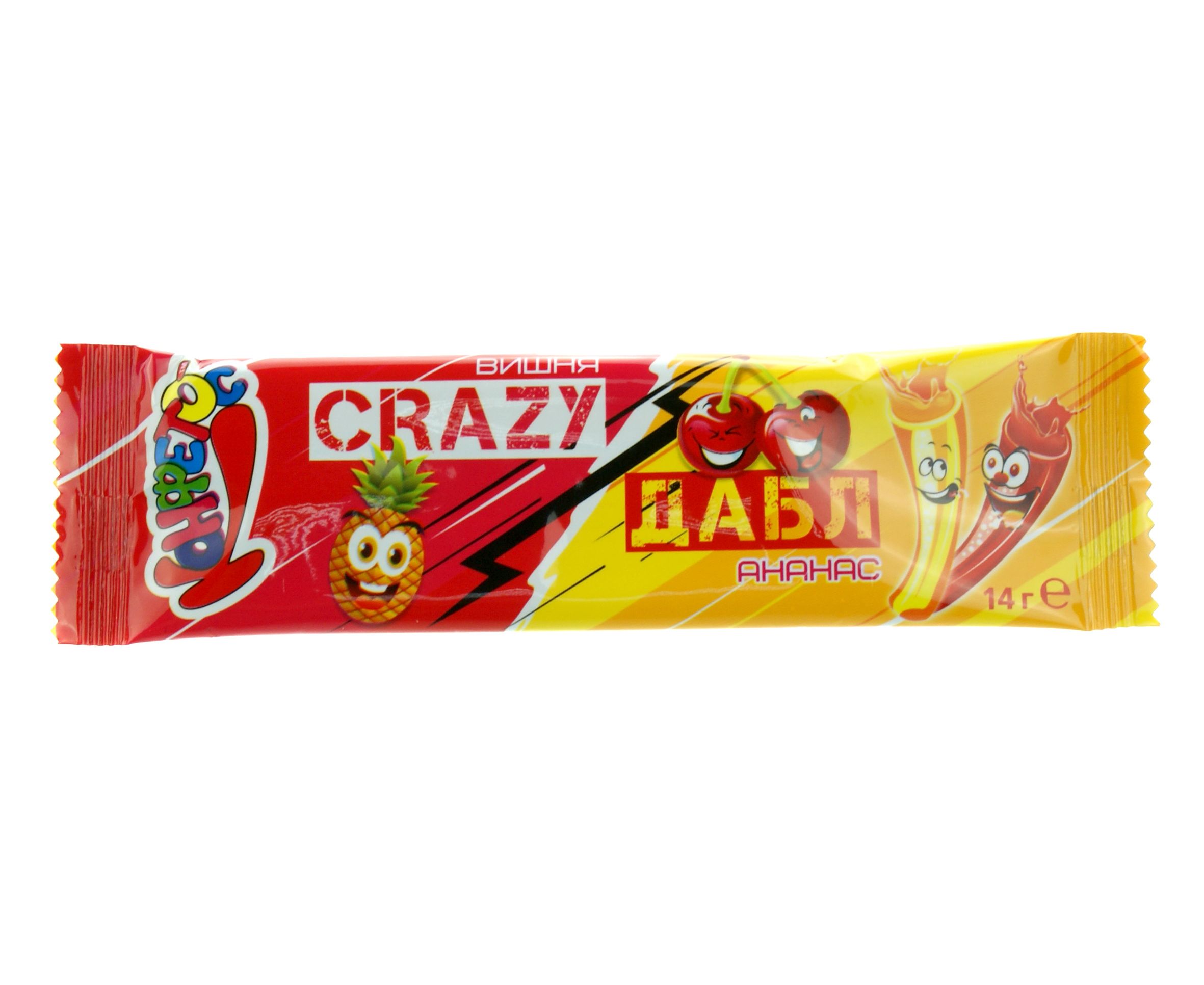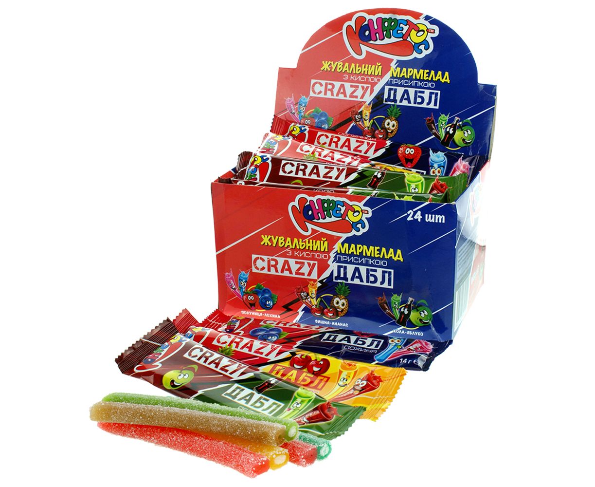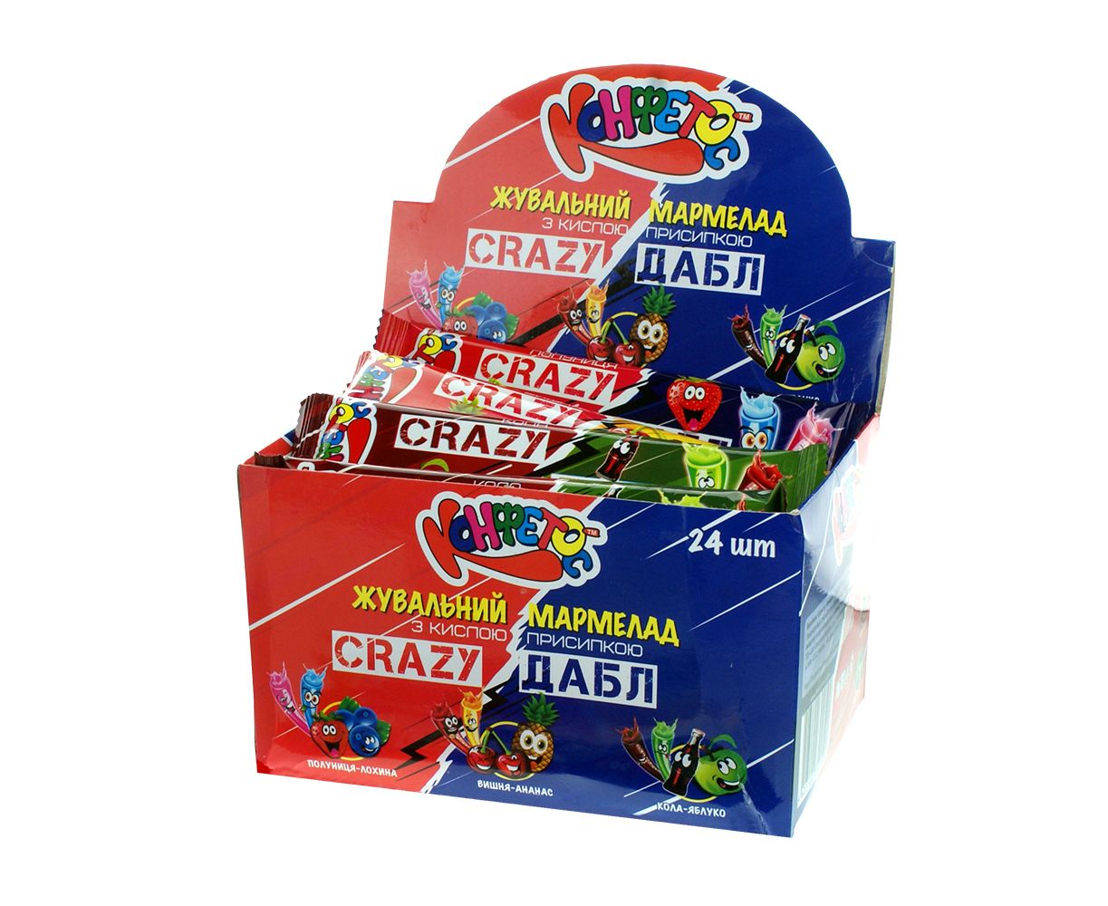 В упаковці жувального мармеладу «Crazy Дабл» ми приготували для вас 24 стику, по дві мармеладні палички в кожному стику, з трьома варіантами смакових поєднань: